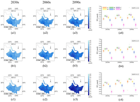 Spatiotemporal distribution of PET0 under SSP1-2.6 (a1–a4), SSP2-4.5 (b1–b4) and SSP5-8.5 (c1–c4) during the rice growth period from 2015 to 2100. The 2030s, 2060s and 2090s represent the period of 2015–2040, 2041–2070 and 2071–2100, respectively. A, B, C, D, E and F represent the returning green stage, tillering stage, jointing booting stage, heading flower stage, milk stage and yellow ripening stage of rice, respectively. In the box-plot, the red line, the black square and the diamond represent the median, the mean and the outliers, respectively.