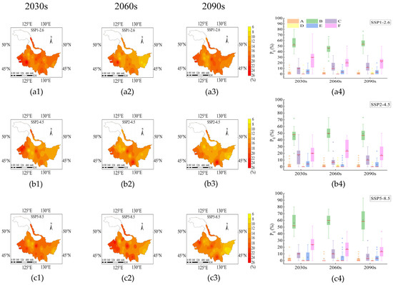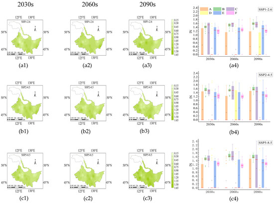From the 2030s to the 2090s, Pr exhibited an increasing trend from northwest to southeast (Figure S1(a1–a3,b1–b3,c1–c3)). The range of mean Pr under SSP1-2.6, SSP2-4.5 and SSP5-8.5 were 3.61–4.12 mm/d, 3.66–4.05 mm/d, and 3.81–4.52 mm/d, respectively (Figure 1(a1–a3)). In both the B and D growth stages, Pr showed an increasing trend from the 2030s to the 2090s under SSP2-4.5 and SSP5-8.5. Under the SSP2-4.5, Pr in the A growth stage demonstrated a distinct trend of initially increasing and then decreasing from the 2030s to the 2090s (Figure 1(a2)). Under SSP5-8.5, Pr in the C growth stage exhibited an increasing trend from the 2060s to the 2090s, with an increase of 0.7 mm/d (Figure 1(a3)).