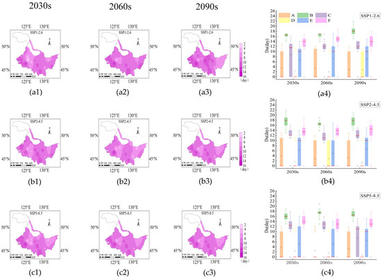 Distribution of Du under SSP1-2.6 (a1–a4), SSP2-4.5 (b1–b4) and SSP5-8.5 (c1–c4) during the rice growth period from 2015 to 2100. The 2030s, 2060s and 2090s represent the period of 2015–2040, 2041–2070 and 2071–2100, respectively. A, B, C, D, E and F represent the returning green stage, tillering stage, jointing booting stage, heading flower stage, milk stage and yellow ripening stage of rice, respectively. In the box-plot, the red line, the black square and the diamond represent the median, the mean and the outliers, respectively.