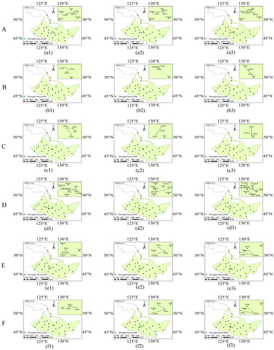 The trajectory of the drought barycenter under SSP1-2.6 (a1–f1), SSP2-4.5 (a2–f2) and SSP5-8.5 (a3–f3) during each growth period of rice from 2015 to 2100. A, B, C, D, E and F represent the returning green stage, tillering stage, jointing booting stage, heading flower stage, milk stage and yellow ripening stage of rice, respectively.