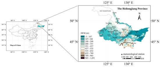 The study area is located in Heilongjiang Province in Northeastern China, lies between latitudes 43°26′–53°33′ N and longitudes 121°11′–135°05′ E, with a total jurisdictional area of 473 million km2, the 6th largest in China. Heilongjiang Province belongs to the continental monsoon climate of cold temperate and temperate zones. It can be divided into humid, semi-humid, and semi-arid zones based on dryness indicators from east to west. The average annual temperature is −5–5 °C, and the annual precipitation is between 400 and 800 mm. Figure 8 provides an overview of the study area, while the sixth accumulated temperature zone, which is currently unsuitable for rice production, is represented by the blank area.