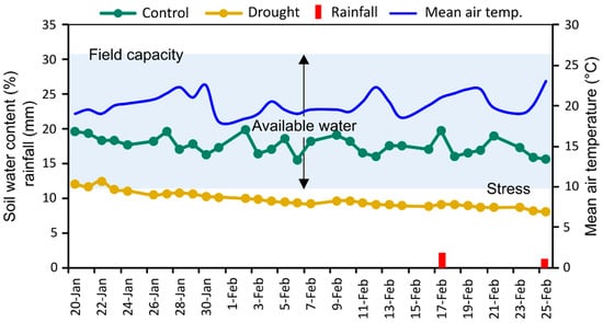 Mean air temperature, rainfall, and soil moisture content (%) in each drought-simulated and control plot during the reproductive phases of wheat genotypes. The experimental site’s soil type is silt loam, with silt, sand, and clay contributions of 50, 26, and 24%, respectively. The full field capacity of the soil was attained at a volumetric soil moisture content of 30.6%. The blue shading area indicating arrows show the available water for plant. Every day, the percentage of soil water in the randomly chosen control and drought-treated plots (n = 15) was assessed.