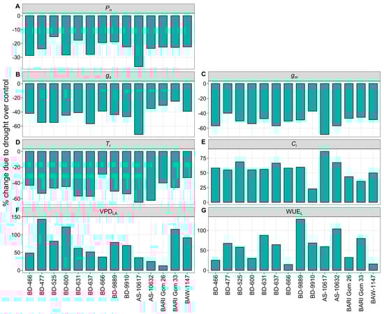 Percent change in the gas exchange parameters such as (A) Net photosynthesis rate (Pn), (B) stomatal conductance (gs), (C) apparent mesophyll conductance (gm), (D) transpiration rate (Tr), (E) intercellular CO2 concentration (Ci), (F) leaf-to-air vapor pressure deficit (VPDLA), and (G) leaf-level instantaneous water use efficiency (WUEL) of 14 wheat genotypes under drought stress relative to well-watered controls.