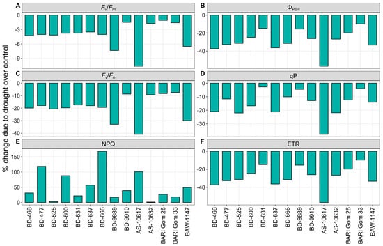 Percent change in chlorophyll a fluorescence parameters—(A) maximal quantum efficiency of PSII (Fv/Fm), (B) quantum yield of PSII (ΦPSII), (C) maximum energy conversion potential of PSII (Fv/Fo), (D) photochemical quenching (qP), (E) non-photochemical quenching (NPQ), and (F) electron transport rate (ETR) of 14 wheat genotypes under drought stress relative to well-watered controls.
