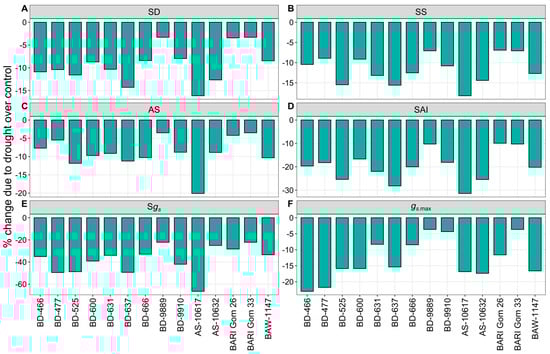 Percent change in stomatal characteristics—(A) stomatal density (SD), (B) stomatal size (SS), (C) aperture space (AS), (D) stomatal area index (SAI), (E) specific stomatal conductance (Sgs), and (F) maximum stomatal diffusive conductance (gs.max) of 14 wheat genotypes under drought stress relative to well-watered controls.