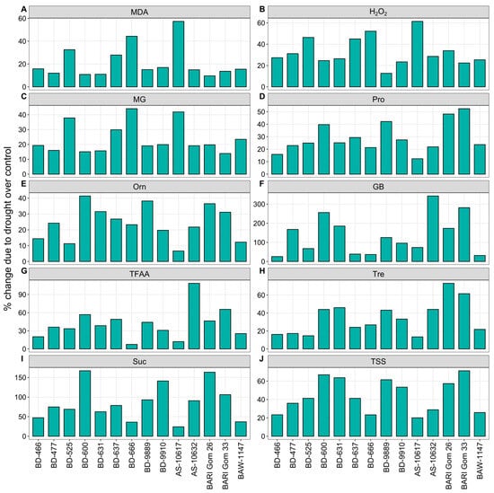 Percent change in (A) malondialdehyde (MDA), (B) hydrogen peroxide (H2O2), (C) methylglyoxal (MG), (D) proline (Pro), (E) ornithine (Orn), (F) glycine betaine (GB), (G) total free amino acid (TFAA), (H) trehalose (Tre), (I) sucrose (Suc), and (J) total soluble sugar (TSS) of 14 wheat genotypes under drought stress relative to well-watered controls.