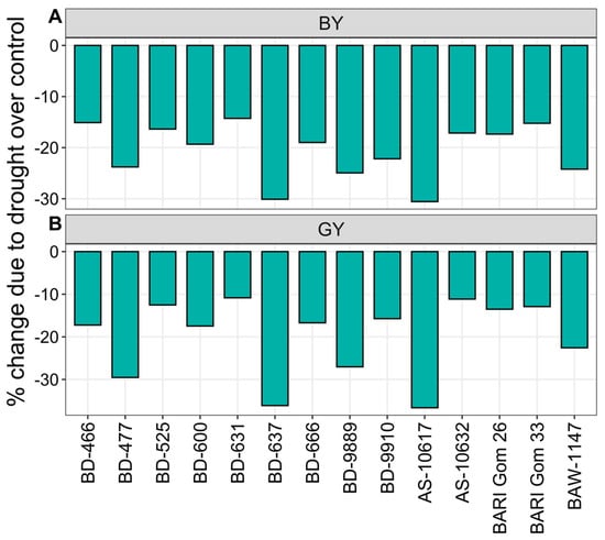 Biological yield (BY) and grain yield (GY) decreased significantly under drought, irrespective of wheat genotypes (Figure 7 and Figure S9). The genotype AS-10617 exhibited the highest decreases in BY and GY in response to drought, with reductions of 31 and 37%, respectively (Figure 7). The lowest decrease in BY was recorded in the genotype BD-631 (14%), followed by BARI Gom 33 (15%) and BD-466 (16%) (Figure 7A). The genotypes BD-631 and AS-10632 showed the lowest reduction (11%) in GY, followed by BARI Gom 33 (13%) and BARI Gom 26 (14%) (Figure 7B).
