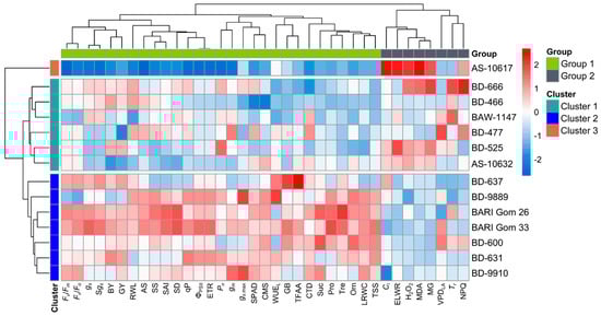 Altogether, Cluster 2 genotypes (BARI Gom 26, BARI Gom 33, BD-631, BD-600, BD-9910, BD-9889, and BD-637) possess relatively greater potential in drought tolerance than the genotypes of Cluster 1 and 3, as evidenced by the minimal changes in physiological traits, gas exchange parameters, ChlF parameters, stomatal characteristics, lower ROS concentration, higher accumulation of osmolytes and greater yield stability under drought. On the other hand, Cluster 1 genotypes (BD-477, AS-10632, BD-666, BD-525, BD-466, and BAW-1147) were rated intermediately drought-tolerant, whereas the solitary genotype AS-10617 of Cluster 3 was deemed drought-susceptible because of its sensitive responses to drought.