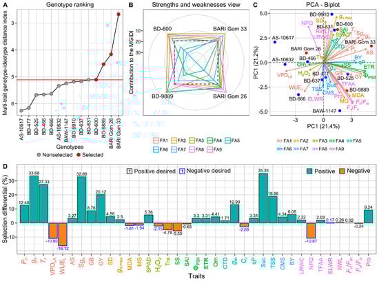 Multivariate analysis of variance (MANOVA) clearly revealed that studied traits are highly significantly different (p < 0.01) among genotypes, environment, and their interaction (Table S7). Except for ΦPSII and ETR, the broad-sense heritability (H2) for all other traits was notably high (ranging from 54 to 96%), indicating their suitability for breeding improvement (Figure S14). Figure 10A shows the genotype ranking according to the multi-trait genotype-ideotype distance index (MGIDI). The genotype scoring a lower MGIDI is considered to be closest to the ideotype genotype and exhibited desirable values for all the studied traits. The MGIDI identified four drought-tolerant genotypes from this investigation: BARI Gom 33, BARI Gom 26, BD-9889, and BD-600 (Figure 10A). Interestingly, all these selected genotypes originated from Cluster 2, which was the highest performing group identified earlier in the hierarchical cluster analysis (Figure 8).