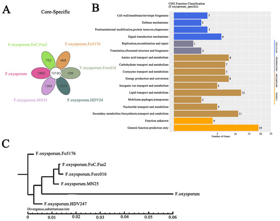 Analysis of gene loss and unique genes in F. oxysporum CCS043 from the rhizosphere of R. glutinosa. Panel (A) is a Venn diagram showing the core and unique genes shared among six strains of F. oxysporum CCS043; panel (B) is a COG functional prediction chart for the 1860 unique genes from F. oxysporum CCS043 from the rhizosphere of R. glutinosa; panel (C) is a phylogenetic tree constructed using the common protein sequences of the six F. oxysporum strains.
