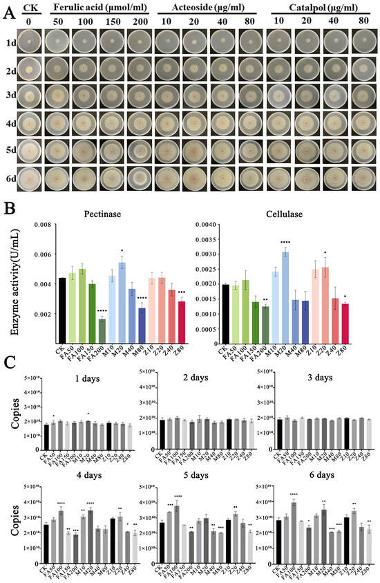 Following the addition of the root exudates of R. glutinosa for a period of 6 days, the diameter of the fungal colony was measured (Figure 2A and Figure S2). A significant trend of hyphal proliferation was observed when the concentrations of ferulic acid, verbascose, and catalpol were set at 100 µmol/L, 20 µg/mL, and 20 µg/mL, respectively, with the growth rates reaching 21.15%, 6.69%, and 9.04%. However, when the concentrations were increased to 200 µmol/L, 80 µg/mL, and 80 µg/mL, a notable inhibitory effect was observed, with inhibition rates of 38.2%, 16.3%, and 25.3%, respectively. These findings indicate that ferulic acid, verbascose, and catalpol exert a significant influence on the proliferation and hyphal growth of F. oxysporum CCS043, exhibiting a pattern where lower concentrations promote growth and higher concentrations suppress it (Figure 2A). Concurrently, as the hyphae developed, changes in the activities of pectinase and cellulase in F. oxysporum CCS043 were also observed. At a verbascose concentration of 20 μg/mL, pectinase activity was significantly enhanced. Similarly, cellulase activity in F. oxysporum CCS043 was highly significantly increased at the same verbascose concentration, reaching its peak on the third day. This enhancement in pectinase and cellulase activities plays a role in the rapid degradation of the host cell wall, thereby facilitating the infection of R. glutinosa by F. oxysporum CCS043 (Figure 2B). Furthermore, daily sampling from the plates shown in Figure 2A was carried out to assess the colony abundance (Figure 2C). It was determined that during the initial three days, the abundance of F. oxysporum CCS043 in both the control (CK) and treatment groups exhibited a gradual increase, with no significant difference observed. However, on the fourth day post-inoculation, with the addition of ferulic acid, verbascose, and catalpol at concentrations of 100 μmol/L, 20 μg/mL, and 20 μg/mL, respectively, the abundance of F. oxysporum CCS043 was 1.33 times, 1.28 times, and 1.10 times higher than that in the CK, achieving a significantly higher abundance than the CK. Although the abundance on the fifth and sixth days remained higher than that in the CK, the increase was not as pronounced as that on the fourth day. This suggests that the fourth day represents a critical phase for the abundance of F. oxysporum CCS043, as an exceptionally active growth phase for the fungus.