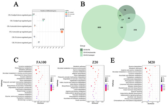 To clarify the molecular mechanisms through which F. oxysporum CCS043 employs autotoxic substances derived from the continuous cropping of R. glutinosa to proliferate and enhance its infectivity, the samples were cultured in media supplemented with 100 μmol/L ferulic acid (FA100), 20 μg/mL acteoside (M20), and 20 μg/mL catalpol (Z20) and a control medium lacking the three allelochemical components (CK) until the fourth day. The sequencing results indicated that the Q30 values for the 12 groups of data ranged from 88.75 to 90.20, while the Q20 values were all above 95.88%, thereby signifying that the databases obtained had high-quality original reads (Table S6). Furthermore, employing a screening threshold of |log2Fold Change| ≥ 1 and a p-value ≤ 0.05, it was found that the ferulic acid treatment group had a total of 153 differentially expressed genes. Of these, 68 were found to be upregulated, and 85 were found to be downregulated. The catalpol treatment group displayed 363 differentially expressed genes, comprising 223 upregulated and 140 downregulated genes, while 17 differentially expressed genes were common to all three treatments (Figure 3A,B). Subsequently, a KEGG enrichment analysis was then performed on the differentially expressed genes from these three groups (Figure 3C–E). Notably, the metabolic pathways were found to be highly similar across the three groups, with pathways such as metabolic pathways, tyrosine metabolism, and styrene degradation being significantly enriched in all three groups. This suggests that ferulic acid, acteoside, and catalpol may exert similar effects on F. oxysporum CCS043 in the rhizosphere of R. glutinosa through analogous mechanisms, thereby facilitating the massive proliferation of the fungus and providing substantial reinforcements for attacking the root system of R. glutinosa.