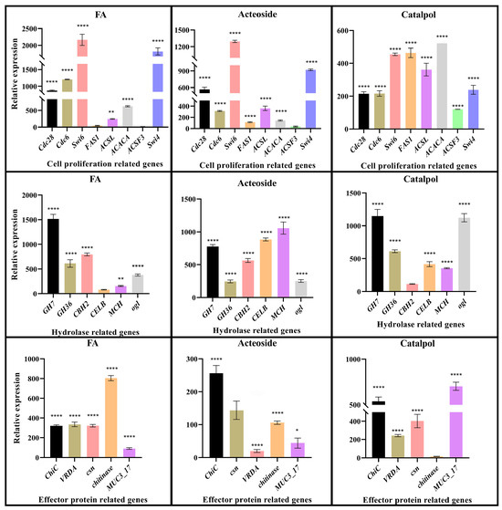 The figure indicates the relative expression levels of the genes encoded by F. oxysporum CCS043. In the treatment names, “FA” represents ferulic acid; “Acteoside” refers to verbascoside; and “Catalpol” represents catalpol. The symbol “*” indicates significant differences between data points (p < 0.05), “**” indicates significant differences between data points (0.01 < p < 0.05), and “****” indicates significant differences between data points (p < 0.0001).
