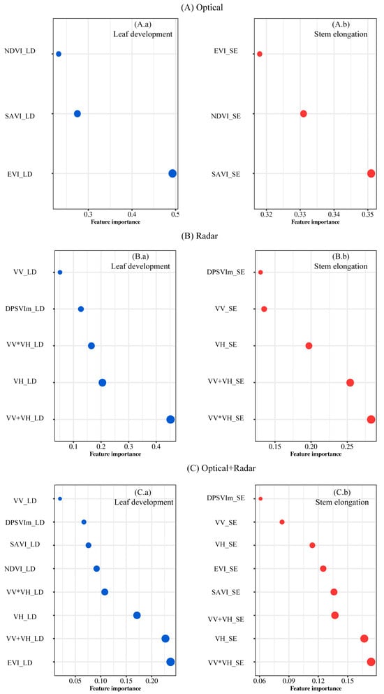 When examining optical parameters individually, SAVI_Tasseling, EVI_Tasseling, and NDVI_LD consistently ranked among the top three in explaining maize density, underscoring the importance of optical parameters during tasseling (Figure 2). For radar parameters, VV*VH_SE, VV+VH_LD, and VV+VH_SE emerged as the most significant, highlighting their key role during the stem elongation stage (Figure 3). Combined estimation results showed a notable improvement in maize density prediction from leaf development to stem elongation and tasseling (Figure 4). The critical importance of SAVI_Tasseling in combined estimation reflects its ability to integrate soil and vegetation reflectance while mitigating soil brightness effects, allowing it to better capture vegetation growth dynamics during tasseling [].