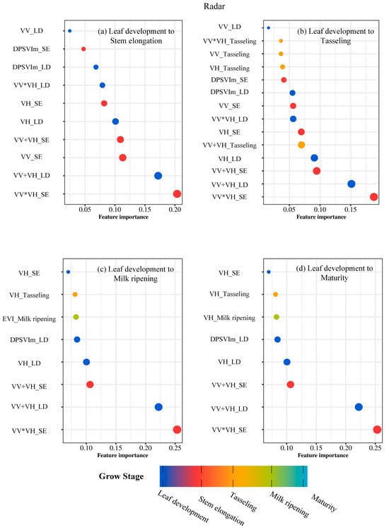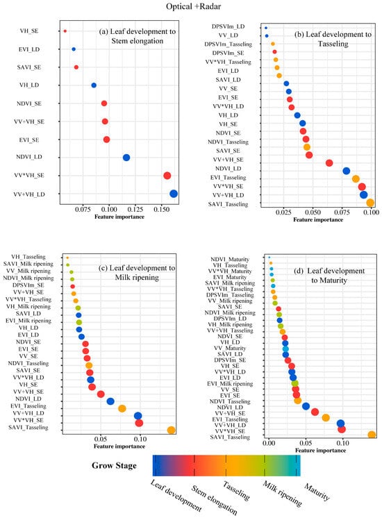 The multi-temporal results emphasize the effectiveness of the RF method, which highlights the importance of vegetation parameters during different growth phases: leaf development to stem elongation, tasseling, milk ripening, and maturity. Key parameters such as SAVI_Tasseling, VV*VH_SE, and VV+VH_LD play pivotal roles in maize density estimation. Radar parameters dominate, with maize’s large leaves significantly enhancing radar backscattering and amplifying the sensitivity of these parameters to density variations [,]. This dynamic interplay highlights the complex relationship between plant morphology and remote sensing signals.