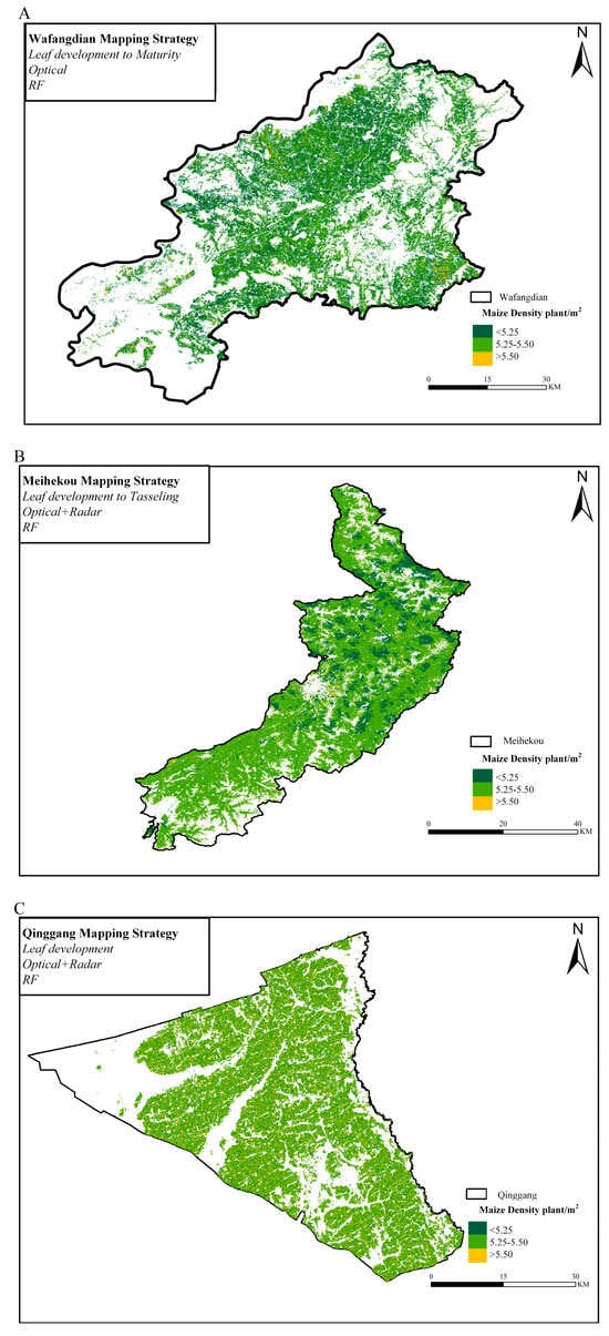 Sentinel-2A and Sentinel-1 GRD data for 2023 were obtained for both sites and three typical demonstration counties. The images from sites were used for modeling, while those from the typical demonstration counties were used to illustrate different mapping strategies. Data for sites were acquired throughout the maize growth cycle to fulfill the needs of multi-temporal maize density modeling. Different types of data were obtained for the three typical demonstration counties at different times due to varying estimation strategies. Optical and radar images during the leaf development stage were obtained for Qinggang, optical and radar images from leaf development to tasseling growth stage were obtained for Meihekou, and optical images from leaf development to the maturity stage were obtained for Wafangdian. All data were acquired with minimal cloud cover guaranteed during acquisition.