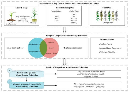 To achieve estimation research on large-scale maize density, an estimation method was designed that encompasses multiple growth stages and multiple parameter types. By identifying the critical growth phase of maize and developing a set of optical radar parameters that are correlated with maize density, three machine learning methods are integrated to estimate maize density. To ensure accurate and efficient estimation of maize density across different stages, two approaches have been implemented: single-temporal and multi-temporal estimation. The single-temporal aims to explore how remote sensing information from different stages represents maize density, while the multi-temporal integrates the capability of various vegetation parameters across multiple growth stages to comprehensively characterize maize density.