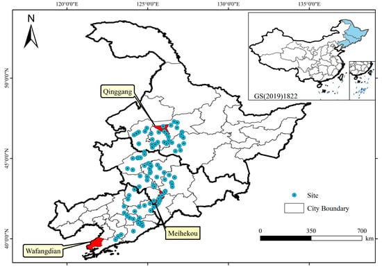 Three typical demonstration counties, Qinggang in Heilongjiang Province, Meihekou in Jilin Province, and Wafangdian in Liaoning Province, were selected within the study area to illustrate the implementation of the large-scale maize density mapping strategy. The three counties were selected to represent different combinations of factors such as maize densities, image coverage, and agricultural management practices (see the Section 4.7 for detailed information).