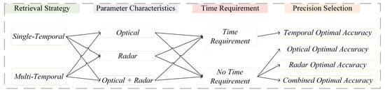 The maize density mapping strategy is shown in Table 3. The table outlines mapping strategies for maize density, encompassing both single-temporal and multi-temporal estimation methods. Each approach indicates the parameters used, the optimal accuracy achieved, and the models used. Of these, radar data for tasseling, optical data for milk ripening, and optical and combined data for maturity were not shown due to insufficient potential for accurate maize density estimation. From the table we can easily access maize density estimation levels for any grow stage, taking into account both data availability and time constraints in different regions. In cases where data is limited, maize density estimation can be performed using either optical or radar data alone. For urgent needs, consulting the table and prioritizing earlier growth stages can effectively meet maize density estimation requirements.