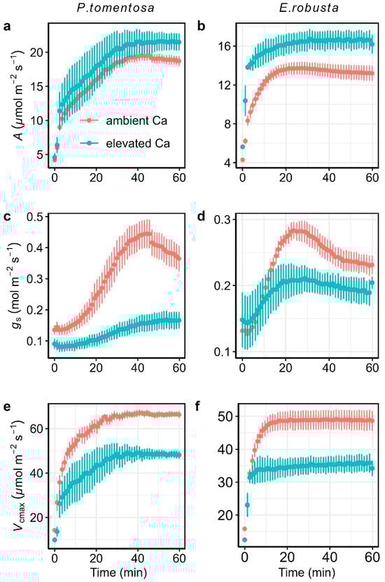 Temporal response of leaf gas exchange parameters to photosynthetic induction under ambient CO2 (ambient Ca, red) and elevated CO2 (elevated Ca, cyan) conditions for Populus tomentosa (left panel) and Eucalyptus robusta (right panel). Parameters include net photosynthesis rate (A; (a,b)), stomatal conductance to water vapor (gs; (c,d)), and maximum carboxylation rate (Vcmax; (e,f)). Vertical bars in each plot represent the standard error from 4 replicate leaves.