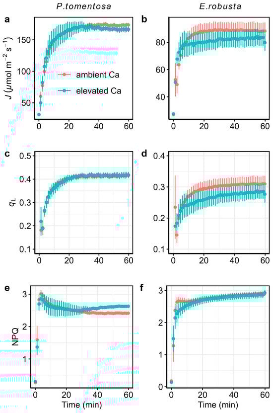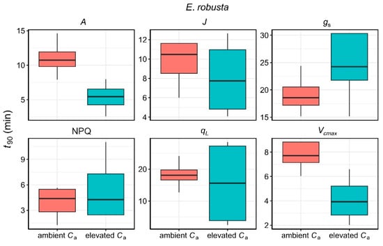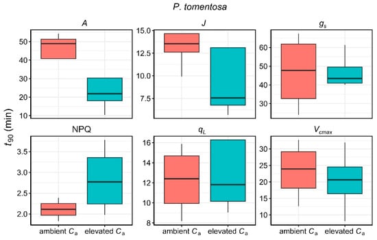 Regarding the time required to reach 90% of the steady-state value (t90), there were no statistically significant differences between ambient and elevated Ca for either species (Figure 3 and Figure 4). Nonetheless, elevated Ca conditions resulted in noticeably faster responses in A, Vcmax, and J in both P. tomentosa and E. robusta, with substantial variability observed in the response of gs, qL, and NPQ.