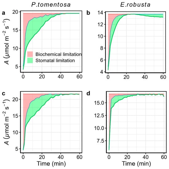Biochemical and stomatal limitations to photosynthesis during photosynthetic induction under ambient Ca (upper panel; (a,b)) and elevated Ca (lower panel; (c,d)) for Populus tomentosa (left panel; (a,c)) and Eucalyptus robusta (right panel; (b,d)). At each time point, the deviation of A from the final steady-state condition (dAcalc) is divided into biochemical limitation (dAbiochem, red area) and stomatal limitation (dAstom, green area). dAcalc represents the linearized difference between steady-state A and the current state A (dA); hence, dAbiochem and dAstom in the figures are normalized by multiplying dA/dAcalc for visual comparison. Under ambient Ca, dAbiochem is calculated based on the derivations of Rubisco-limited photosynthesis, while under elevated Ca, it is calculated based on the derivations of electron transport-limited photosynthesis.