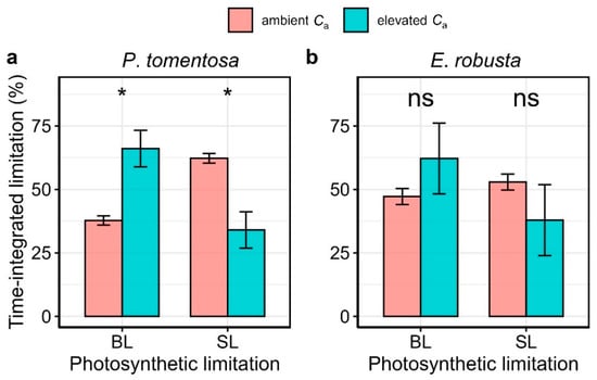 Quantitative time-integrated relative limitations by biochemical effects (BL) and stomatal effects (SL) under ambient and elevated Ca for Populus tomentosa (a) and Eucalyptus robusta (b). Asterisks (*) indicates significant differences in time-integrated relative limitations between ambient and elevated Ca at p < 0.05 according to the Wilcoxon signed-rank test, while ’ns’ denotes non-significant differences.