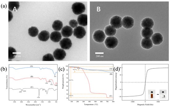 The morphology of the polymer was measured using a transmission electron microscope (TEM). As can be observed in Figure 1a(A), the image of the Fe3O4 nanoparticles reveals a relatively uniform spherical structure. Figure 1a(B) shows the morphological structure of the Fe3O4@SiO2-RAFT, which clearly shows that the thickness of the shell membrane of the core-shell structure increases slightly. It was proved that Fe3O4@SiO2-RAFT nanoparticles were successfully prepared and could be used for subsequent imprinting. These observations demonstrated that the RA-HMMIPs had been successfully synthesized.