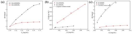 Isotherm models and fitting curves of RA-HMMIPs and RA-HMNIPs. Image (a): Static absorption curves. Image (b): Langmuir isotherm model fitting curves. Image (c): Freundlich isotherm model fitting curves.