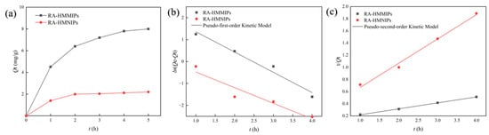The kinetic adsorption diagrams of RA-HMMIPs and RA-HMNIPs are presented in Figure 3a. The adsorption amount increased rapidly for the first 3 h, then gradually slowed down and reached equilibrium after 5 h, and the adsorption amount of MIPs was 8.012 ± 0.54 mg/g. Because the polymer has many sites that can form hydrogen bonds with RA, it enhances the affinity and accelerates the adsorption process. Once all the sites are filled, the interior of the polymer is the only remaining area for RA adsorption; the interior can only adsorb RA at a low rate. Eventually, all the sites are occupied, and the adsorption process reaches equilibrium. The kinetic adsorption curve of the NIPs exhibited a similar trend to MIPs, with an imprinting factor (IF) of 3.636, which substantiates its efficacy in RA adsorption.