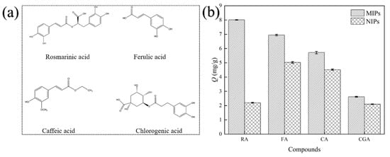 One of the most significant advantages of MIP technology in comparison to alternative separation techniques is its high degree of selectivity for the template in question, when compared to other compounds of a similar nature and structure. It is based on the generation of specially designed components for the target compound. So, caffeic acid (CA), ferulic acid (FA), and chlorogenic acid (CGA) served as the reference analogs for the selectivity adsorption experiment. The structures of the compounds employed in this essay are illustrated in Figure 4a. Equilibrium adsorption capacities of RA, CA, FA, and CGA on MIP and NIP are shown in Figure 4b, while the selectivity coefficient and imprinting factor are listed in Table 4.