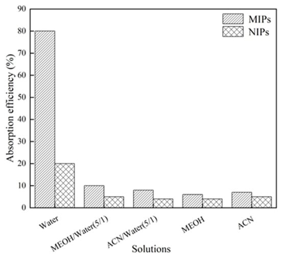 The hydrophilic performance of RA-HMMIPs was investigated in water and mixtures: acetonitrile (ACN) to water (5/1), methanol (MEOH) to water (5/1), and ACN and MEOH. As shown in Figure 6, the adsorption efficiency in water was significantly higher than the others, and the adsorption capacity of RA was also higher than that of RA-HMNIPs. These results indicate that the polymer is highly hydrophilic and has more RA sites of action.