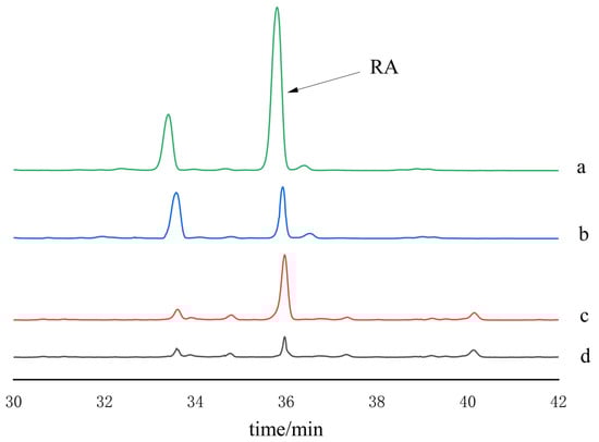 The determination of RA was performed using an LC-2030 (Shimadzu, Kyoto, Japan). The instrument parameters were as follows: mobile phase, 0.1% methanoic acid/methanol (65:35, v/v); column temperature, 35 °C; flow rate, 0.9 mL/min; detection wavelength, 330 nm; and injection volume, 10 μL. Samples are filtered through a 0.22 μm membrane prior to analysis.