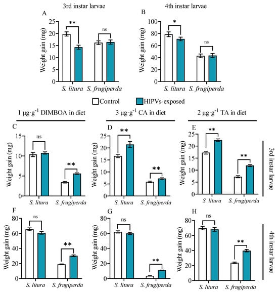 Weight gain of 3rd and 4th instar larvae of S. frugiperda and S. litura fed on artificial diets containing DIMBOA, chlorogenic acid, and tannic acid with or without exposure to maize HIPVs. The larvae were exposed to HIPVs released from living maize plants as shown in Figure S1. Weight gain of 3rd and 4th instar larvae fed on artificial diets without toxin addition (A,B), containing 1 μg·g−1 DIMBOA diet (C,F), 3 μg·g−1 chlorogenic acid (D,G), and 2 μg·g−1 tannic acid (E,H) for 48 h. Data are mean ± SE (n = 25). Asterisks indicate significant differences in comparison with control (Student’s t-test, * p < 0.05, ** p < 0.01, ns, p > 0.05).