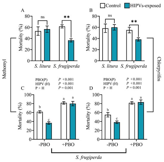 Insecticide tolerance of S. frugiperda and S. litura larvae to methomyl and chlorpyrifos after exposure to maize HIPVs. The larvae were exposed to HIPVs released from living maize plants as shown in Figure S1. Larval mortality was measured 24 h after exposure to maize HIPVs and methomyl (A) or chlorpyrifos (B). Asterisks indicate significant differences in comparison with unexposed control (Student’s t-test, ** p < 0.01, ns, p > 0.05). Tolerance to methomyl (C) and chlorpyrifos (D) after exposure of S. frugiperda larvae to maize HIPVs and the insecticide synergist piperonyl butoxide (PBO). Data are mean ± SE (n = 20). Different letters indicate significant differences (p < 0.05) between different treatments (Two-way ANOVA).