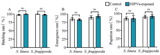 Effects of larval exposure to maize HIPVs on the developmental process of S. litura and S. frugiperda. (A) Egg hatching rate, (B) pupation rate, and (C) emergence rate. Data are mean ± SE (n = 100). Asterisks indicate significant differences in comparison with unexposed control (ns, p > 0.05).