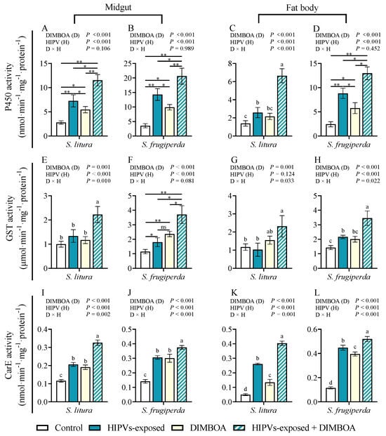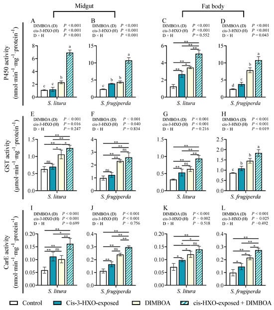 Activities of cytochrome P450 enzymes (P450s) (A–D), glutathione-s-transferase (GST) (E–H), and carboxylesterase (CarE) (I–L) in the midguts and fat bodies of 4th instars of Spodoptera litura and S. frugiperda after exposure to cis-3-hexen-1-ol (cis-3-HXO) and feeding on DIMBOA-containing diet. The larvae were exposed to cis-3-hexen-1-ol (cis-3-HXO) and 1 μg·g−1 DIMBOA diet for 24 h. Asterisks indicate significant differences in comparison with control (Student’s t-test if the interaction between HIPVs and DIMBOA was not significant, * p < 0.05, ** p < 0.01, ns, p > 0.05). Different letters above bars indicate significant differences among treatments (p < 0.05) according to two-way ANOVA with Tukey’s multiple comparison test (if the interaction between HIPVs and DIMBOA was significant).