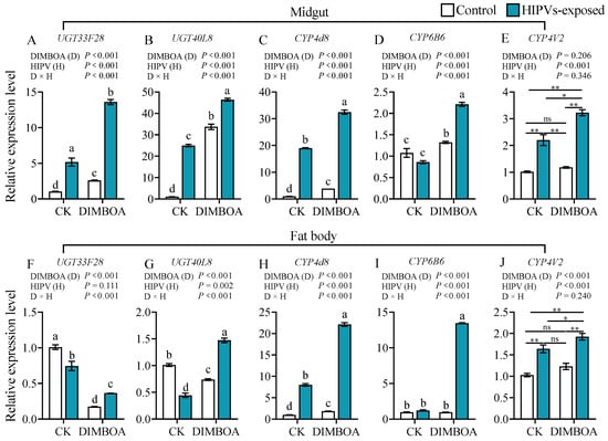 Transcript levels of UGT33F28, UGT40L8, LOC118270728, CYP4d8, and CYP4V2 in the midguts and fat bodies of 4th instars of S. frugiperda after exposure to maize HIPVs and feeding on DIMBOA-containing diet. The larvae were exposed to maize HIPVs and 1 μg·g−1 DIMBOA diet for 24 h. Tissues dissected from five larvae were pooled, and three biological replicates were run for each treatment. Data are mean ± SE (n = 20). Asterisks indicate significant differences in comparison with control (Student’s t-test if the interaction between HIPVs and DIMBOA was not significant, * p < 0.05, ** p < 0.01, ns, p > 0.05). Different letters above bars indicate significant differences among treatments (p < 0.05) according to two-way ANOVA with Tukey’s multiple comparison test (if the interaction between HIPVs and DIMBOA was significant).