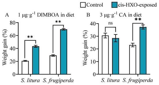Weight gain of 4th instars of S. litura and S. frugiperda fed on diets containing 1 μg·g−1 DIMBOA (A) and 3 μg·g−1 chlorogenic acid (CA) (B) after exposure to volatile compound cis-3-hexen-1-ol (cis-3-HXO). The larvae were exposed to volatile cis-3-HXO as shown in Figure S2. Data are mean ± SE (n = 50). Asterisks indicate significant differences in comparison with unexposed control (Student’s t-test, ** p < 0.01).
