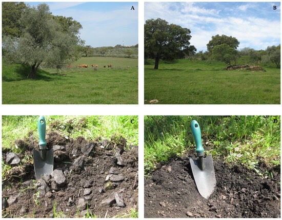 In recent decades, Ferragudo mining area has been an agrosilvopastoral system extensively managed, which includes holm oak (Quercus ilex L.), with low density, spaced by a homogeneous and dense coverage of a biodiverse pasture composed mainly of species from families Poaceae and Asteraceae (Figure 1A,B). Although some spontaneous species can exist in the pasture land, most of them were sown. In very limited areas, especially with high stoniness, there are patches of autochthonous shrubs with Cistus and Lavandula species.