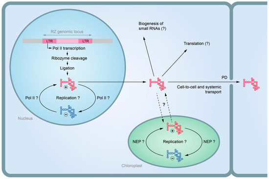 Proposed model for the retrozyme life cycle in plants. In the nucleus, activation of the retrozyme promoter located in the retrozyme (RZ) LTR and transcription of the RZ genomic locus results in the retrozyme transcript. The RZ transcript is cleaved by ribozymes located in the LTRs; the resulting RNA has a 5′-hydroxyl and a 2′,3′-cyclic phosphate end, which are ligated to give the retrozyme circular form. Since the site of retrozyme RNA replication is unknown, it has been proposed to occur either in the nucleus or, in analogy to Avsunviroids, in the chloroplast where the retrozyme RNA may be transported after exit from the nucleus to the cytoplasm, as indicated. In the nucleus, the retrozyme RNA can be replicated by Pol II as known for Pospiviroids, whereas in the chloroplast replication can depend on the RNA polymerase NEP, as known for Avsunviroids. In both cases, the replication products must then be transported to the cytoplasm for subsequent trafficking through plasmodesmata (PD) to neighboring cells and systemic leaves. It is likely that at this stage, the structured retrozyme RNA can be recognized by DCL proteins, which process it into small RNAs that can regulate the level of accumulation of the targeted mRNAs. Alternatively, the retrozyme circRNA may act as a template for protein expression or bind cellular miRNAs to act as a miRNA sponge.