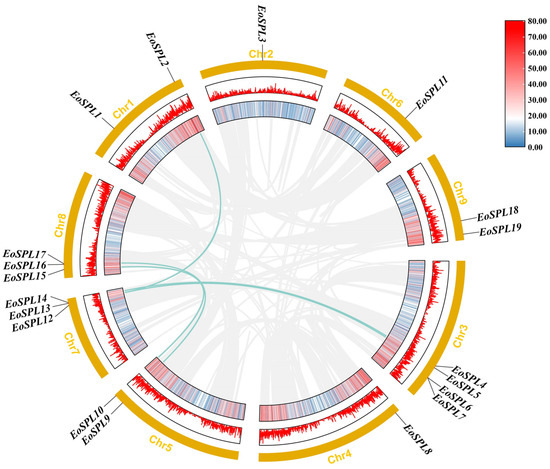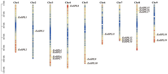 The distribution of 19 EoSPLs across the chromosomes. The colors on the chromosomes reflect varying levels of gene density. Blue to red colors within the chromosomes indicate increased gene density. Each chromosome is accompanied by its respective number, and the genes are labeled on the right side of the respective chromosomes for clarity.