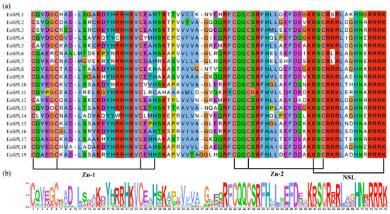 The multiple alignment (a) and sequence logo (b) of the SBP domains in the 19 EoSPL proteins.
