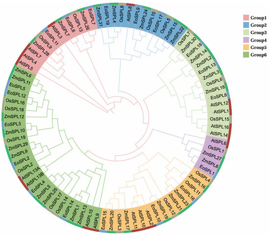 Genes closely related to evolution may have similar functions. To explore the evolutionary relationship of the SPL gene family, the protein sequences of SPLs from centipedegrass, Arabidopsis, rice, and maize were used to construct the phylogenetic tree (Figure 3). The EoSPL proteins were classified into six unique groups (Group 1 to Group 6), with each group harboring at least one EoSPL protein. The most extensive group (Group 6) comprised 26 proteins. In the phylogenetic tree, all EoSPL proteins exhibit closer evolutionary relationships with members of maize, indicating that the functions of some SPL genes in centipedegrass can be inferred from homologous genes in maize.