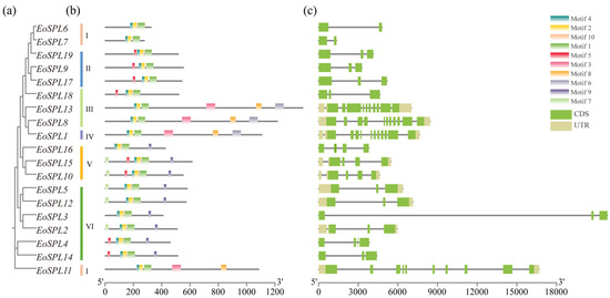 Phylogenetic relationships, motifs, and gene structures in EoSPL genes. (a) The phylogenetic tree was constructed based on the EoSPL protein sequences using TBtools-II. (b) The motif composition of the EoSPL proteins was performed using TBtools-II. (c) Gene structures of the EoSPL genes. Green boxes indicate CDS regions; grey boxes indicate UTR regions. I-VI is the grouping of EoSPL proteins in the phylogenetic tree.