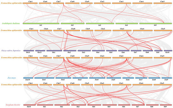 MCScanX was used to identify individual EoSPL gene duplication events throughout evolutionary history [54]. The gene duplication events of EoSPL genes were visually represented using TBtools-II [50]. Collinearity analysis of EoSPL genes between centipedegrass and other species (Arabidopsis, rice, maize, and sorghum) was performed using TBtools-II [50]. Furthermore, the gene duplication time was calculated according to the formula: T = Ks/2λ (λ = 6.5 × 10−9) [55].