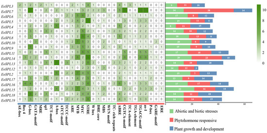 Cis-elements of the EoSPLs. The color gradient from lighter to dark green represents the number of elements from lower to higher.
