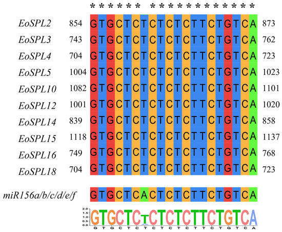 To enhance our understanding of the miR156-mediated regulation of the expression of EoSPLs at the post-transcriptional level, a multiple sequence alignment analysis was conducted by identifying potential target sites of miR156 within the coding regions of the EoSPLs (Figure 8). The results show that 10 EoSPL genes had target sites in the coding region, indicating that miR156 may have a potential regulatory effect on these EoSPL genes. This study found that miR156 influenced the coding regions of EoSPL2, EoSPL3, EoSPL4, EoSPL5, EoSPL12, and EoSPL14, which belong to Group 6. Additionally, it influenced EoSPL10, EoSPL15, and EoSPL16 from Group 5 and EoSPL18 from Group 3. The findings imply that the post-transcriptional regulation of SPLs by miR156 is a conserved characteristic among plant species.