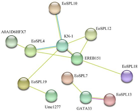 To delve deeper into the potential interactions between EoSPL proteins and other proteins, we performed PPI predictions. A total of five proteins (A0A1D6HFX7, EREB151, Umc1277, GATA33, and KN-1) were identified as having strong interactions with EoSPL proteins (Figure 9). EREB151 belongs to the AP2-EREBP transcription factor family, which suggests that there is likely to be an interaction between the EoSPL proteins and the AP2-EREBP protein. The robust interaction between SPL proteins and other proteins suggests that they may share common functional roles.