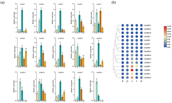 The expression levels of EoSPLs across various plant tissues. (a) The expression levels of 15 EoSPL genes were examined using a qRT-PCR assay. Error bars indicate the standard deviation (SD) derived from three replicates. Lowercase letter(s) above the bars indicate significant differences (α = 0.05, LSD) among various plant tissues. (b) Expression values are based on qRT-PCR and visualized using TBtools-II. High expression levels are represented by red, while low expression levels are indicated by blue. R: root; ST: stem; L: leaf; F: flower; SP: spike.